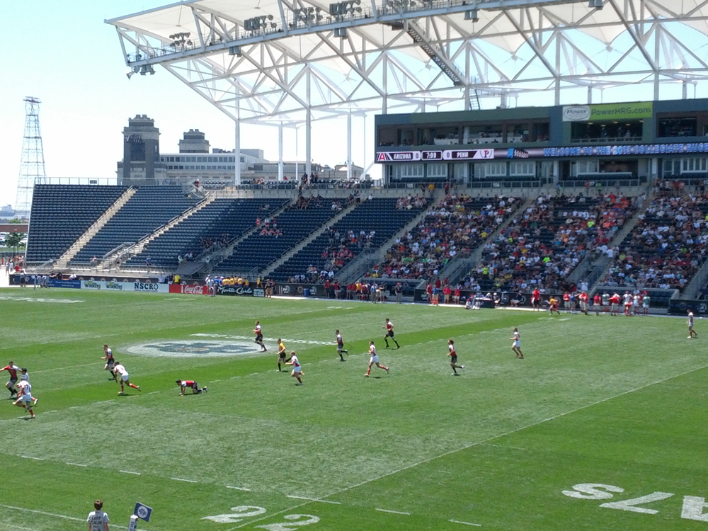 The Penn Men’s Rugby team competed in the College Rugby Championships this past weekend at PPL Park, home of the Philadelphia Union. The College Rugby Championship is a “7s” tournament – Sevens is the rugby variant which will be played in the Olympics in 2016. It’s 7-on-7 for 7 minute halves. This was Penn’s first year in the College Rugby Championship. The Penn Alumni Club of Philadelphia joined Penn Rugby Alumni and current Penn students to cheer on the Quakers.
