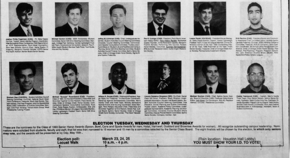 Penn Class of 1993 Senior Honor Award nominees published in The Daily Pennsylvanian for Ivy Day #93tothe25th University of Pennsyvlania