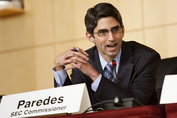Troy A. Paredes recently completed his term as commissioner of the US Securities and Exchange Commission (SEC), serving throughout the financial crisis and its aftermath, during which time the SEC undertook numerous initiatives to restructure the regulation of financial markets, including the SEC advanced rule makings to implement the Dodd-Frank Act and the JOBS Act. Before his government service, Mr. Paredes was a professor of law and a professor of business (by courtesy) at the Washington University in St. Louis. He has also been a visiting professor of law at UCLA and Georgetown. He practiced law in California at O’Melveny & Myers, Steptoe & Johnson, and Irell & Manella, where his practice focused on financings, mergers and acquisitions, and corporate governance. He is the author of numerous academic articles and is a coauthor of a multivolume securities regulation treatise, Securities Regulation.