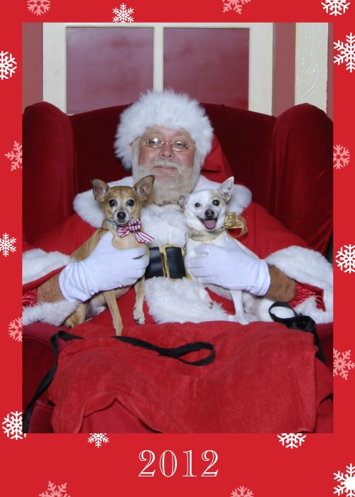 Finally, here are my “angels,” as we affectionately call them when they’re running around the house barking at the possum in our yard. Standing in line at the mall with a bunch of other dogs around was  a bit overstimulating, so I’m amazed they were able to sit still for this photo with Santa. Koa and Lau Lau are trying to be on their best behavior so that they’ll be on Santa’s Nice list.